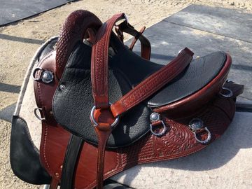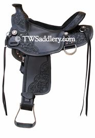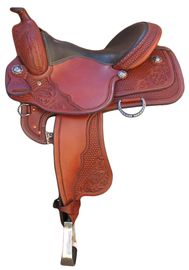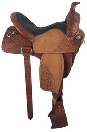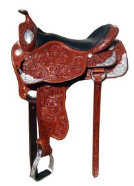 Lots of options! Padded seat colors, full Floral Tooling, Engraved Aluminum Offset Stirrups, Leather latigo, and additional optional accessories. Classic reining seat design and light weight. 23 lbs.