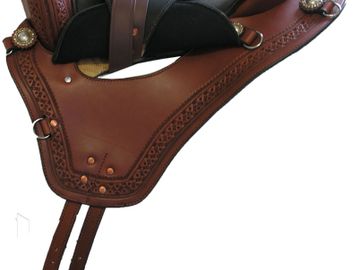 Short pommel with sufficient wither clearance. Narrow twist padded seat. Edge tooling. Padded leather or sude seat. Total length 23" with short square skirt. 20 lbs.