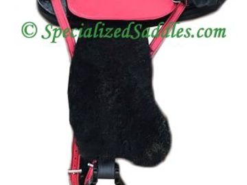Sheepskin with oil tan leather back that is sweat and water resistant. Easy on knees and no break in time. Made w/ 1.5" biothane stirrup leathers and require a 1.5"-2" stirrup neck. Roller buckle and easy to adjust.